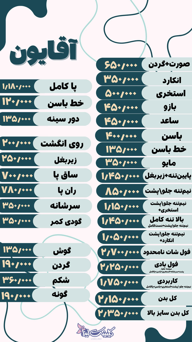 کلینیک زیبایی لیزا تهران : تمامی خدمات این مرکز زیبایی شامل: لیزر، تزریق بوتاکس و فیلر، هایفو و مزوژل، لاغزی با دستگاه، فشیال، کربوکسی تراپی و … در این مرکز به بهترین قیمت و کیفیت ممکن به شما عزیزان ارائه میشود. همچنین جهت سهولت لیست به روز قیمت تمامی خدمات برای شما در زیر قرار گرفته است.
